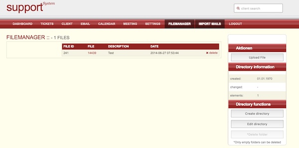 Login support: File manager. All important documents can be uploaded here and later inserted into the mails/ticket response at the touch of a button